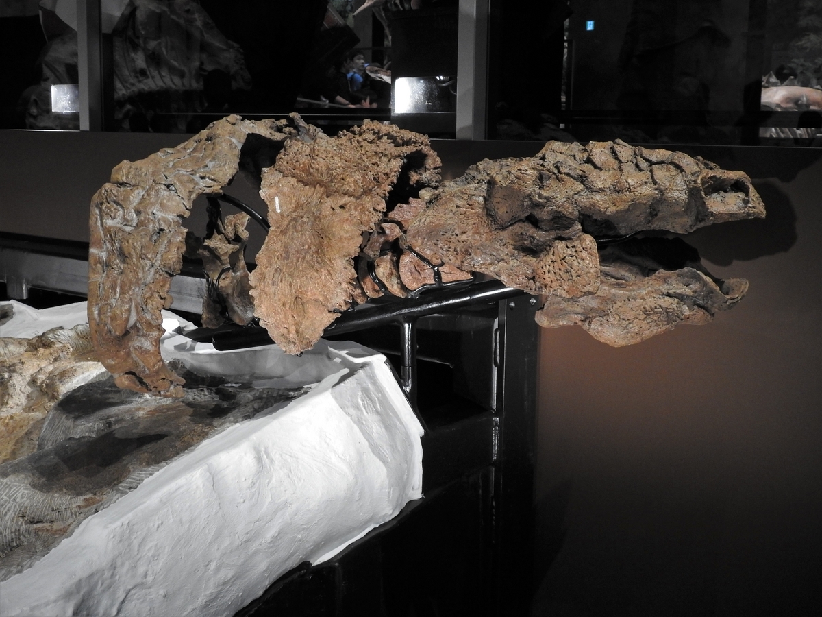 頭部と頸部。アンキロサウルス科の頸にはハーフリングと呼ばれる皮骨がある。理由はよくわからないが前方のハーフリングのみ実物だそう。頭部はともかく第2ハーフリングはなぜレプリカなのだろう?さすがに残ってなかったか、あるいは破損していたのか。それとハーフリングで見えづらいけど4つの頸椎も組み込まれている。頸椎が実物かは不明。