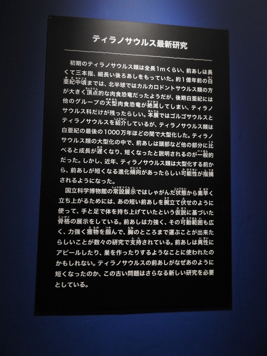 皮膚痕についての言及はなかった(※図録にはある)が、代わりに前肢について詳しく解説している。短いが肩関節は丸く、筋肉さえあれば可動範囲は広かったと考えられており、何のために使っていたのかは不明。『Prehistoric Planet』(2022, 邦題は『太古の地球から~よみがえる恐竜たち~』)では求愛のために使われたとされ、ユーモラスなダンスを踊るカルノタウルスの映像が製作された。